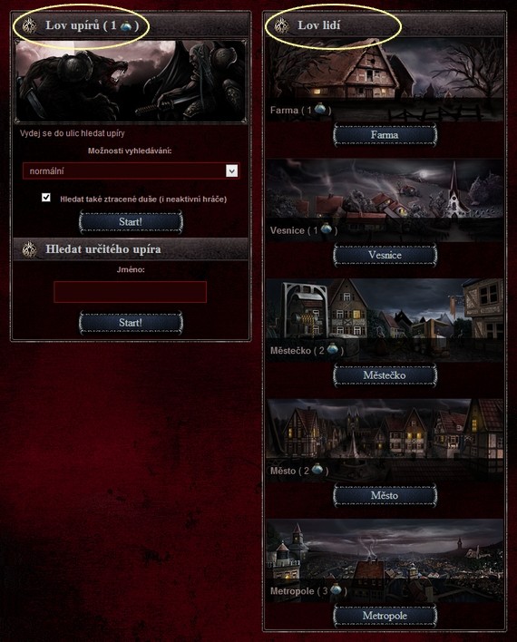 Pokud tě popadne lovecká vášeň a neláká tě Jeskyně či úkoly v Hospodě, můžeš si zalovit skutečné hráče (opačnou rasu) nebo si v okolí zalovit lidi. Stačí si jen vybrat, na co máš chuť a co tě víc láká. |